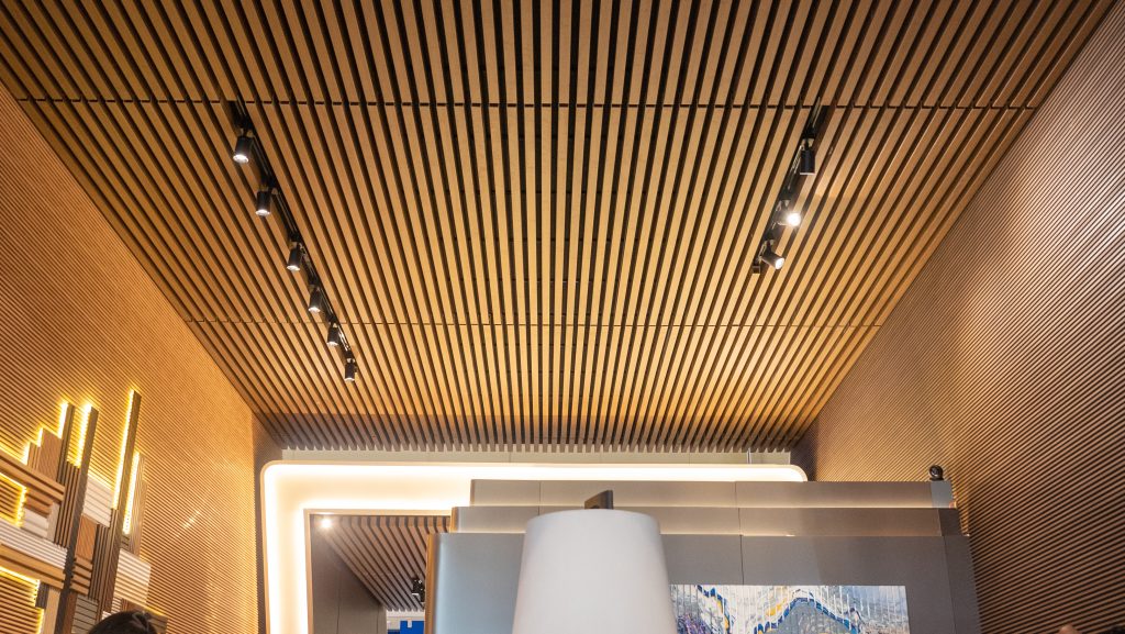 Seluruh stan dibangun menggunakan produk Panelku. Dindingnya dilapisi dengan Panel Dinding Panelku dan Lembaran WPC, memberikan tampilan yang modern dan bersih. Bahkan area tempat duduk di dalam stan dibuat dari WPC Sheets, menunjukkan bagaimana material ini dapat bergaya dan fungsional.