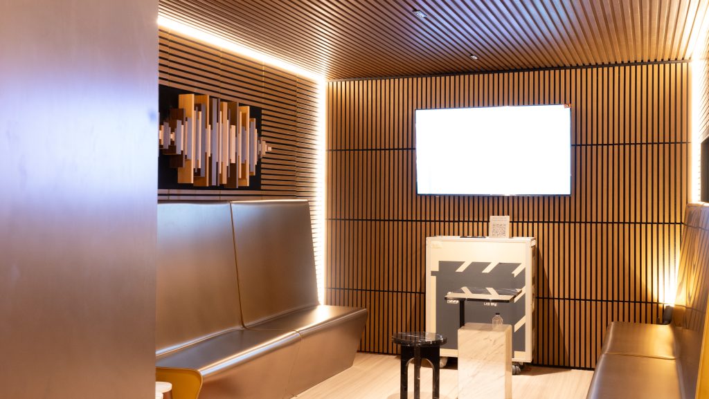 Di dalam stan, terdapat juga area lounge dan podcast khusus, yang menggunakan Panel Akustik Panelku untuk menjaga ruangan tetap tenang dan damai, ideal untuk percakapan dan rekaman.